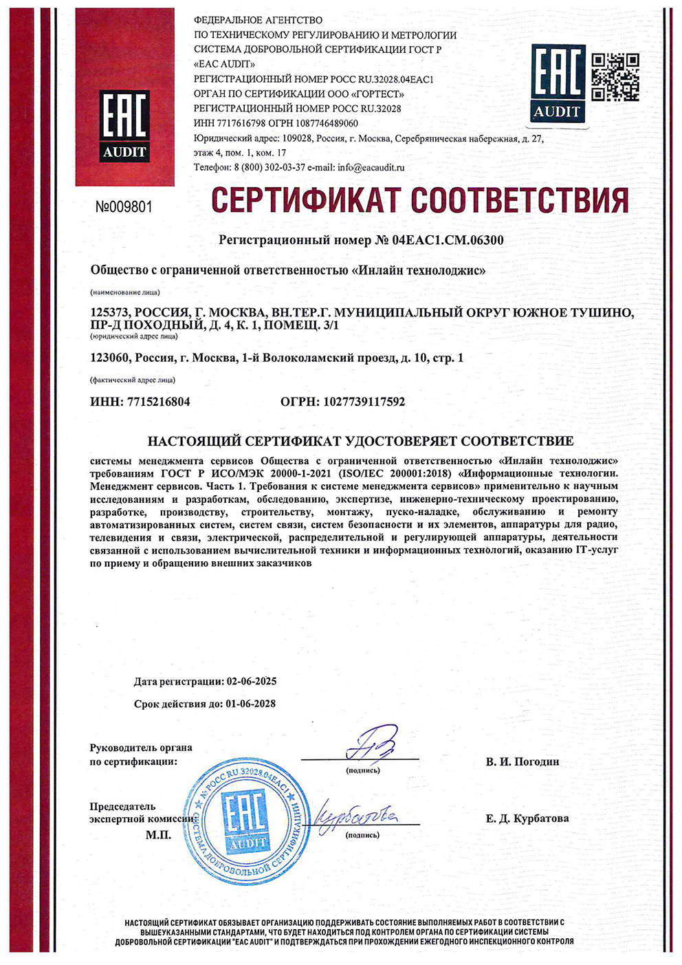 Сертификат удостоверяет, что система менеджмента сервисов INLINE Technologies применительно к научным исследованиям и разработкам, обследованию, экспертизе, инженерно-техническому проектированию, разработке, производству, строительству, монтажу, пусконаладке, обслуживанию и ремонту автоматизированных систем, систем связи, систем безопасности и их элементов, аппаратуры для радио, телевидения и связи, электрической, распределительной и регулирующей аппаратуры, деятельности, связанной с использованием вычислительной техники и информационных технологий, оказанию ИТ-услуг по приему и обращению внешних заказчиков соответствует требованиям ГОСТ Р ИСО/МЭК 20000-1-2021 (ISO/IEC 200001:2018) «Информационные технологии. Менеджмент сервисов. Часть I. Требования к системе менеджмента сервисов».