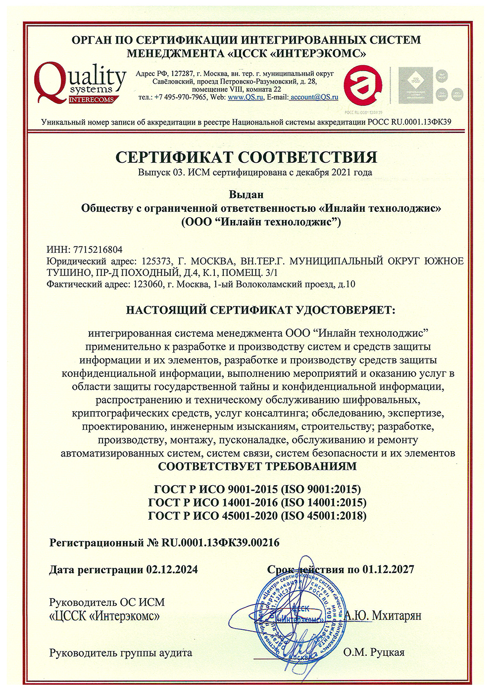 Сертификат удостоверяет, что интегрированная система менеджмента качества INLINE Technologies применительно к разработке и производству средств защиты информации и их элементов, разработке и производству средств защиты конфиденциальной информации, выполнению мероприятий и оказанию услуг в области защиты государственной тайны и конфиденциальной информации, распространению и техническому обслуживанию шифровальных, криптографическиз средств, услуг консалтинга; обследованию, экспертизе, проектированию, инженерным изысканиям, строительству; разработке, производству, монтажу, пусконаладке, обслуживанию и ремонту автоматизированных систем, систем связи, систем безопасности и их элементов соответствует требованиям ГОСТ Р ИСО 9001-2015 (ISO 9001:2015), ГОСТ Р ИСО 14001-2016 (ISO 14001:2015), ГОСТ Р ИСО 45001-2020 (ISO 45001:2018).